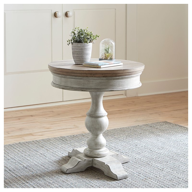 Accent your space with the Heartland round pedestal chair side table. Crafted of rubberwood solids with cathedral white oak veneers, this piece features an antique white finish with a planked tobacco top, anchored by a round turned pedestal with X base. This classic chair side table would make a great addition to any traditional space.
